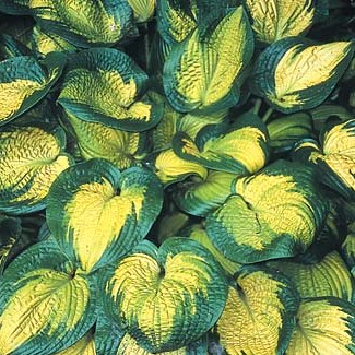 Hosta 'Paradigm' features shiny, thick, gold leaves with jetting blue-green margins. Plants emerge solid green in spring, the variegation intensifies as the season progresses. A little direct morning sunlight will give you an amazing gold colored center. Multi award winner. Excellent slug resistant foliage. (Walden-West/Purtyman 1999)