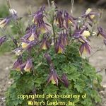 Aquilegia flabellata 'Blackcurrent Ice'. A true dwarf species that forms a compact mound of foliage topped off by lots of bi-color creamy yellow and purple flowers. A tough little plant. Will self-seed. Columbine.