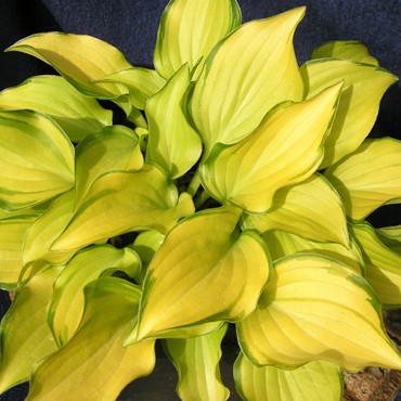 Hosta 'Cracker Crumbs' is a sport of 'Shiny Penny'. Displays slightly cupped, lightly wavy, shiny, bright gold leaves with dark green margins. The thin green line along the margin looks like it has been hand painted, like fine china. A strong grower with good substance. (Solberg 2002)