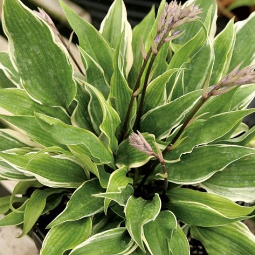 Hosta 'Fall Dazzler'. Compact wavy foliage with white margins is topped off with tall dark purple flowers in late summer. Mature leaves measure 5" long by 2.5" wide. This hosta was discovered in the wilds of Japan.