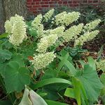 Heuchera villosa macrorrhiza 'Autumn Bride'. The velvety lime green leaves are shaped like the leaf of a maple tree. A late season bloomer with bouquets of white flowers. Tolerates dry shady locations better than most coral bells. Tends to self-seed, giving it ground cover status.