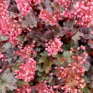Heuchera 'Mysteria'. Lovely ruffled and silvered leaves set the stage for the free-flowering spikes of coral pink flowers. A heat tolerant plant that is no mystery to grow, likes good drainage like all coral bells. A reliable performer and in bloom all summer! A 2010 Terra Nova release. PP#21576.