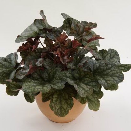 Heuchera 'Kira Jungle Green'. Jungle Green’s lively green veins stand out against multicolor green, silver and burgundy-red leaves. Quickly forms a dense compact mound. PPAF.