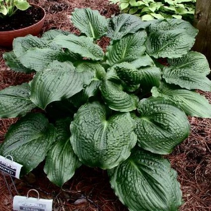 Hosta 'Lakeside Prophecy' displays dark green, slightly shiny, wavy, heavily corrugated leaves. Displays beautiful texture. A wonderful substitution for hosta 'Embroidery'. A fast grower. A seedling of unknown origin. Unique.
