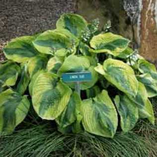 Hosta 'Linda Sue'. A thick leaved sport of 'Frances Williams'. Blue green centers are framed with wide, 3" gold margins. Heavily corrugated and slug resistant. Leaf margins do not scorch like its parent.