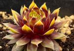 Sempervivum 'Gold Rush'. An amazing addition to the "Chick Charms" line of Collectable Hen and Chicks. A seedling from Chris Hansen's 'Gold Nugget'! 'Gold Rush' features brilliantly colored foliage of ruby-red and gold with thin leaves that are held stiffly upright. The dramatic coloration is best in the cool seasons. In summer the plant morphs to all green with just a tiny touch of red. Four seasons of splendor! As is the case with all sempervivium do not over water this plant, grow on the dry side. Photography courtesy: Chris Hansen. PPAF